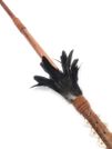 This beautiful piece of art is 60" long, there are a total of 16 authentic shark teeth, the wood used for this specific item is Koa and has woven loops of fibers also called olona (a Hawaiian shrub, the bark of which was valued as a source of strong, durable fiber). The spear can either be hung or mounted. Please note that the feathers arrangement may vary slightly".