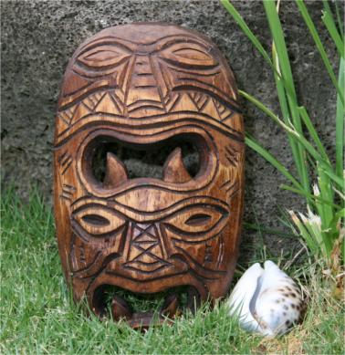 This is a wood carved Fijian tiki mask with 2 deities representing STRENGTH & ABUNDANCE. The mask measures 8 inches tall.