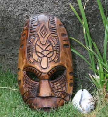 This is a wood carved Fijian TURTLE tiki mask. He is the symbol of THE WINNER. The deity is representing the OCEAN GOD. The mask measures 8 inches tall.