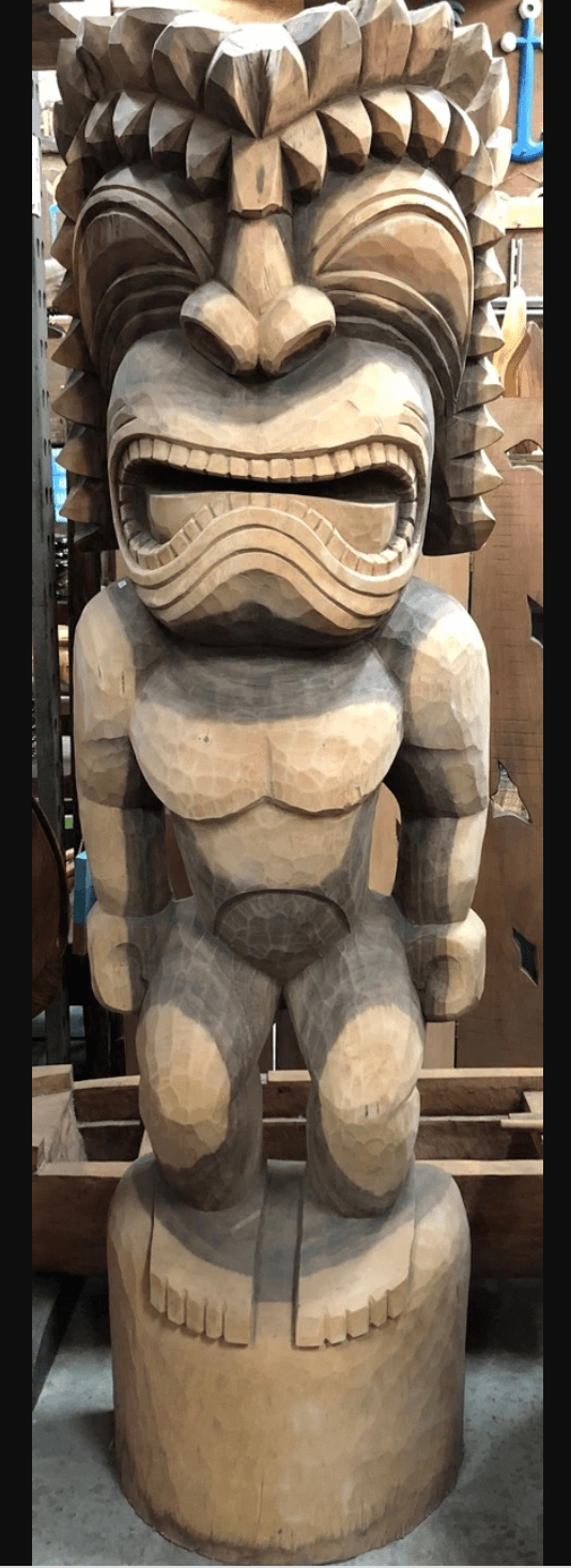 Here is a beautiful Tiki measuring 7' tall, made out of solid wood. Tiki Ku is mostly known as the Tiki of strength, sunrise, good crop and love. He is the god of fishing, who built the first fishpond in Hana. He is the god of husbandry and farming, represented by the 'o'o , the digging stick, which penetrates the earth and makes it fertile. He is the god of war and conflict, but also of resolution and healing."