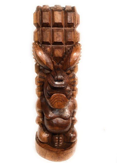 Here is a beautiful Tiki measuring 60" tall, made out of solid wood. Tiki Ku is mostly known as the Tiki of strength, sunrise, good crop and love. He is the god of fishing, who built the first fishpond in Hana. He is the god of husbandry and farming, represented by the 'o'o , the digging stick, which penetrates the earth and makes it fertile. He is the god of war and conflict, but also of resolution and healing."