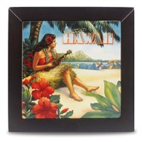 Bring the beauty of the islands home with our 8" Framed Ceramic Tiles. Each tile is 100% earthenware. These ceramic tiles are heat resistant and can be utilized as trivets. The back of the ceramic tile has a four black felt feet at corners and metal hook for hanging. ISLAND ART CERAMIC TILE: Artist renderings of iconic island imagery are captured in vivid color on these decorative molded Island Art Ceramic Tiles. Each 6.25" x 6.25" tile is embedded into a dark cherry wood MDF frame. Tile framed finish size measures approximately 8"H x 8"W x .5" thick. These tiles are currently unboxed.