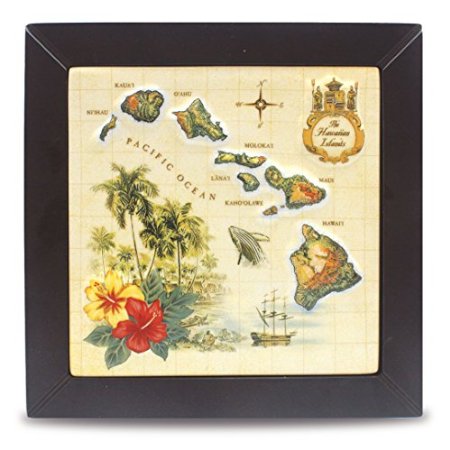 Bring the beauty of the islands home with our 8" Framed Ceramic Tiles. Each tile is 100% earthenware. These ceramic tiles are heat resistant and can be utilized as trivets. The back of the ceramic tile has a four black felt feet at corners and metal hook for hanging. ISLAND ART CERAMIC TILE: Artist renderings of iconic island imagery are captured in vivid color on these decorative molded Island Art Ceramic Tiles. Each 6.25" x 6.25" tile is embedded into a dark cherry wood MDF frame. Tile framed finish size measures approximately 8"H x 8"W x .5" thick. These tiles are currently unboxed.