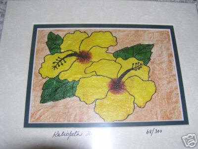 This is a beautiful, hand made, tapa cloth depicting Yellow Hibiscus Flowers. The Tapa cloth framable area with the mat as seen on the picture measures 10 X 8 inches.