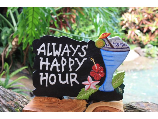 This is a hand made wooden tiki bar sign with the wording: "ALWAYS HAPPY HOUR" and featuring beautiful plumeria flowers and refreshing cocktail. A great sign to give your tiki bar a very tropical look. Also, perfect for your home or your outdoor living area!