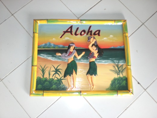 Here is a hand made vintage looking bamboo sign with the wording "ALOHA" and featuring two hula girls on the beach. This wooden vintage Hawaiiana sign has been hand painted with great attention to details.