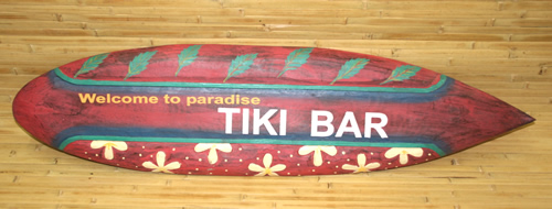 This is a hand made, retro Hawaiian carved wood "TIKI BAR" welcome sign. It is flanked by sculptured and painted plumeria flowers.