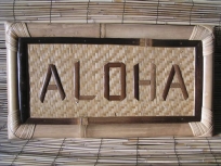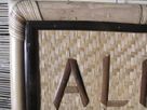 This is a hand made, bamboo Tiki bar sign with the wording "ALOHA". This retro tiki sign was hand made and has a bamboo frame, backed with a tropically, woven lauhala mat.