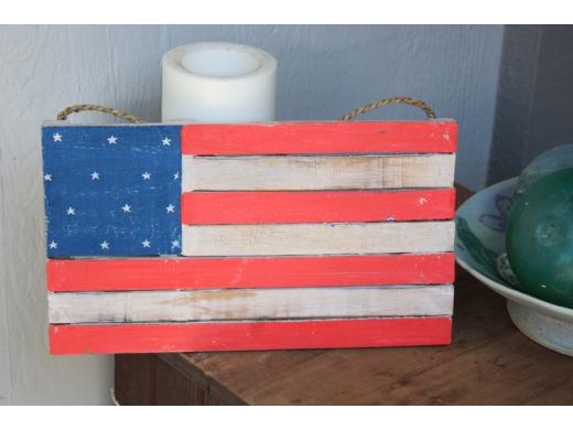 Here is a very charming hand carved and hand painted USA flag with a rustic finish of blue, red and white.