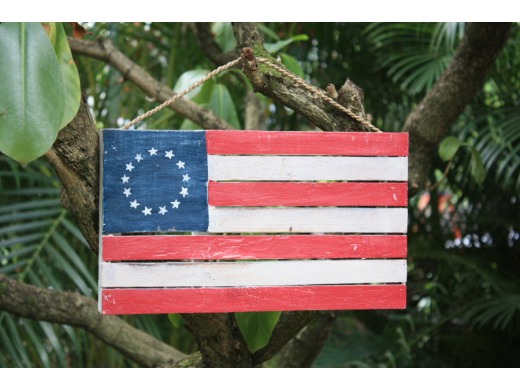 Here is a very charming hand carved and hand painted USA flag with a rustic finish of blue, red and white.