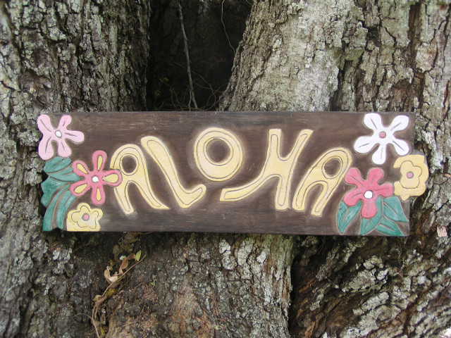 This is a hand made, retro Hawaiian roxy "ALOHA" tiki hut sign with tropical flowers. Each letter of ALOHA is hand carved and raised. The sign has been hand painted which gives it an artistic and rustic feel. This great piece of handycraft measures 24 inches wide by 8 inches tall (60cm x 20cm). It comes ready to hang with 2 hooks in the back.