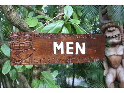 This is a hand made wooden "MEN" TIKI BAR sign with a antique/rustic finish, featuring some petroglyph carvings as well as a carved Tiki on the side.