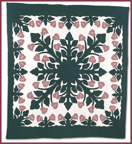 Each "Kapa" (Quilt in Hawaiian...) is hand quilted by Master Quilters taught in the traditional Hawaiian style of quilting. Each Quilt has over 250,000 stitches and average 6-8 stitches per inch. We appliqué the design using the hidden or "blind" stitch onto the background material. It is then quilted with a ripple or echo pattern. Every piece is hand made with great care to insure your total satisfaction and comes with matching pillow shams. Please contact us for availability and special orders (NO EXTRA COST!).