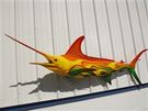 This striped marlin is an orange, green and yellow theme with an old school tribal flame pattern. The yellow tribal flame is hand pin striped with a dark orange and the eye is painted with the themed colors. This fish is electric in person compared to the pictures shown here.