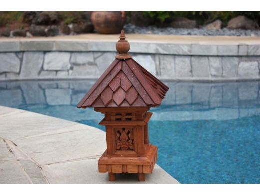 Here is a beautiful outdoor/indoor tropical lantern in the style of a Sumatran house which is made of wood and was treated for the outdoors. The pointy roof is a very durable fibre from the trunk of the sugar palm tree - called ijuk. The sugar palm is the tallest of Bali's palm trees.
