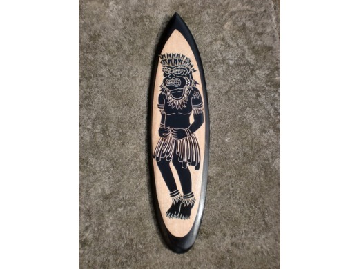 Here is a hand carved tiki set on a wooden surfboard and hand painted. This wall hanging piece depicts the god of surfing (ready to hang!).