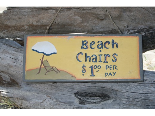 Here is a Hawaiian beach/cottage style "BEACH CHAIRS $1 PER DAY" welcome sign in rustic white & blue coastal colors.