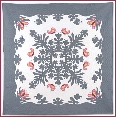 Each "Kapa" (quilt in Hawaiian...) is hand quilted by Master Quilters taught in the traditional Hawaiian style of quilting. Each Quilt has over 250,000 stitches and average 6-8 stitches per inch. We appliqué the design using the hidden or "blind" stitch onto the background material. It is then quilted with a ripple or echo pattern. Every piece is hand made with great care to insure your total satisfaction and comes with matching pillow shams. Please contact us for availability and special orders (NO EXTRA COST!).