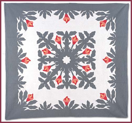 Calalily designs are fun and colorful. This handsome quilt can be matched with similar wall hangings and pillow slips. It is hand stitched with great care; this quilt is guaranteed to become a treasured heirloom which will last a lifetime.