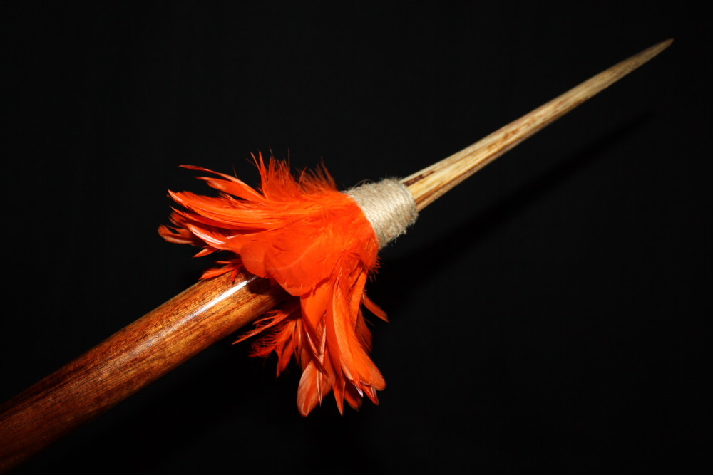 Here is an intimidating Hawaiian spear made out of KOA with a blue marlin bill also known as pahoa i a me lei-o-mano. This beautiful piece of art is 32" long (marlin bill is 10" and koa shaft 22"), the wood used for this specific item is Koa from the Big Island and has woven loops of fibers also called olona (a Hawaiian shrub, the bark of which was valued as a source of strong, durable fiber). The spear can either be hung or mounted. Please note that the feathers arrangement may vary slightly".