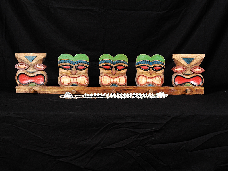 This tropical wall hanger has hand carved, colorful happy tiki faces on it.
