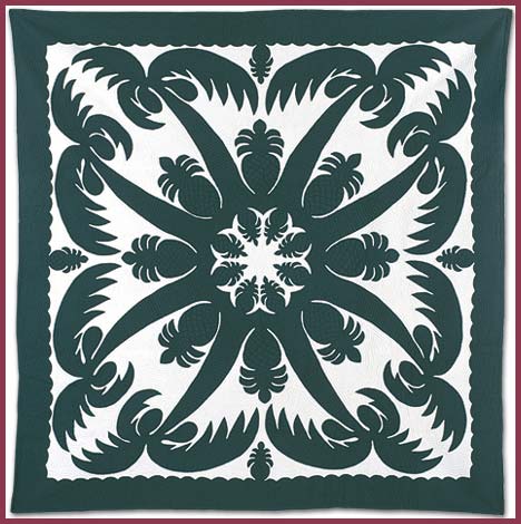 This Hapa Haole design, is a contemporary quilt showcasing two of the most recognizable symbols of Hawai’i, the Coconut Tree and the Pineapple, symbolizing both wealth and abundance. Probably our most requested colors for this quilt are the Hunter Green on off white and the very popular Sea-foam Green on off white. Have fun with this exotic quilt!