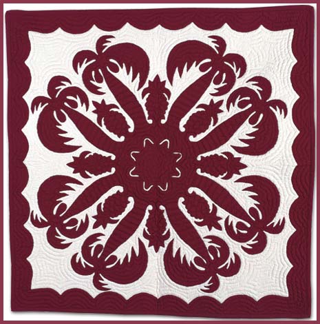 Each wall hanging is hand quilted by Master Quilters taught in the traditional Hawaiian style of quilting. Each Quilt has over 250,000 stitches and average 6-8 stitches per inch. We appliqué the design using the hidden or "blind" stitch onto the background material. It is then quilted with a ripple or echo pattern. Every piece is hand made with great care to insure your total satisfaction. Please contact us for availability and special orders (at NO EXTRA COST!).
