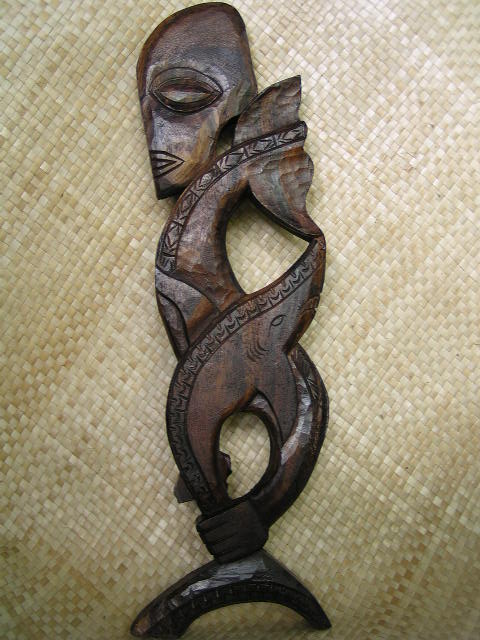 This is an art fully sculptured Cook Islands statue. The Shark was a popular Aumakua in the Cook Islands, and Tangaloa was the people's deity. Here the two are carved in effigy depicting that they are one spirit, controlled by Tangaloa. A contemporary carving of Ancient beliefs.