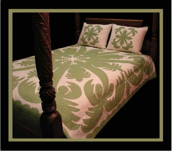 Each "Kapa" (Quilt in Hawaiian...) is hand quilted by Master Quilters taught in the traditional Hawaiian style of quilting. Each Quilt has over 250,000 stitches and average 6-8 stitches per inch. We appliqué the design using the hidden or "blind" stitch onto the background material. It is then quilted with a ripple or echo pattern. Every piece is hand made with great care to insure your total satisfaction and comes with matching pillow shams. Please contact us for availability and special orders (NO EXTRA COST!).