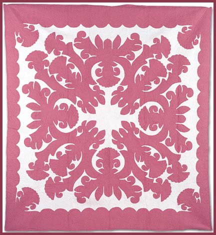 This two color Hawaiian quilt is named "CROWN FLOWER". It was Queen Liliuokalani’s favorite flower. An exquisite, regal design! The pattern flows beautifully to the corners of the bed and shows very well.