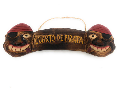 This exotic "CUARTO DE PIRATA" - pirate's quarters - PIRATE SIGN was hand painted and hand carved by experienced carvers and features two pirates heads. The sign comes ready to hang.