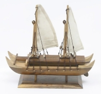 Here is a very detailed and traditional double hull warrior sailing canoe from Hawaii. This art piece was handcrafted with great attention to details; made from solid acacia koa wood. The canoe seats a on wooden base.