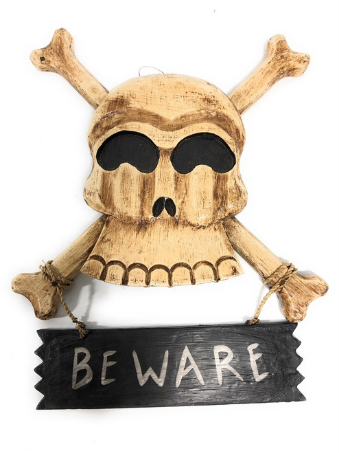 This exotic skull & bones sign has a carved skeleton featuring a skull and two cross bones as well as a tiki sign reading "DO NOT ENTER".