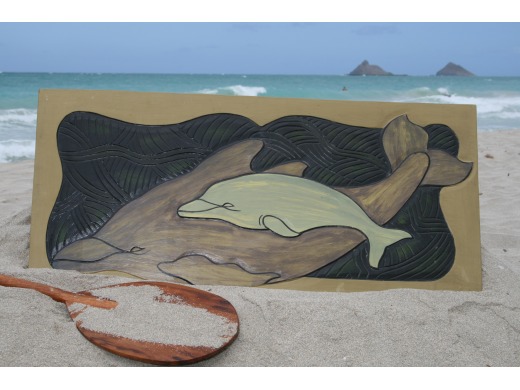 Here is a beautiful wooden storyboard, hand carved and hand painted featuring DOLPHIN WITH CALF: Story of the Endangered Species.