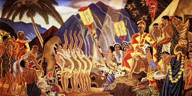They immediately received highest acclaim from critics and customers alike. The American Institute of Graphic Arts awarded him their highest reward, the Certificate of Excellence. Today this series of menu covers is part of the permanent collection of The Smithsonian Institution. What make them so unique is that the soulfulness of Hawaii is displayed in spectacular color and detail on a 4 x 8 canvas. It captures the aloha spirit of the people, the gracefulness of the hula in "Pomp and Circumstance" and the connection to the land in the "Festival of the Sea".