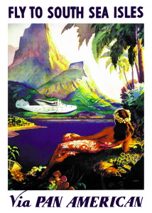 When Pan American introduced in 1946 it's first flights for tourists from San Francisco to Hawaii, this airline poster, with the island girl lounging in the fore ground and the China Clipper approaching the island in the back ground, was the first of many travel advertising posters. The towering peaks in the background are unmistakably the silhouette of Moorea, which are famous for the Bali Hai scene in the film South Pacific. It is certainly suggestive of an island welcome by the polynesian vahine, reclining on the shore watching and waiting for the plane to land...