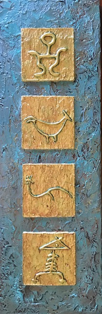 This painting has a richly textured background in earthy tones of copper, browns, antique bronze and gold, with a verdigris blue green patina resembling moss covered lava rock. The raised relief of the petroglyphs combined with the textured background create a beautiful 3D effect. It will add a distinctive Hawaiian theme and contemporary, tropical feel to your home and a touch of royalty to your walls!