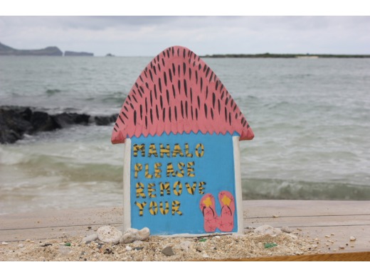 Here is a beautifully handcrafted sign with "PLEASE REMOVE YOUR SLIPPERS - MAHALO" sign and a pair of carved slippers inside.