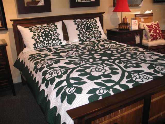 Each "Kapa" (Quilt in Hawaiian...) is hand quilted by Master Quilters taught in the traditional Hawaiian style of quilting. Each Quilt has over 250,000 stitches and average 6-8 stitches per inch. We appliqué the design using the hidden or "blind" stitch onto the background material. It is then quilted with a ripple or echo pattern. Every piece is hand made with great care to insure your total satisfaction and comes with matching pillow shams. Please contact us for availability and special orders (NO EXTRA COST!).