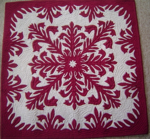 Each wall hanging is hand quilted by Master Quilters taught in the traditional Hawaiian style of quilting. Each Quilt has over 250,000 stitches and average 6-8 stitches per inch. We appliqué the design using the hidden or "blind" stitch onto the background material. It is then quilted with a ripple or echo pattern. Every piece is hand made with great care to insure your total satisfaction. Please contact us for availability and special orders (at NO EXTRA COST!).