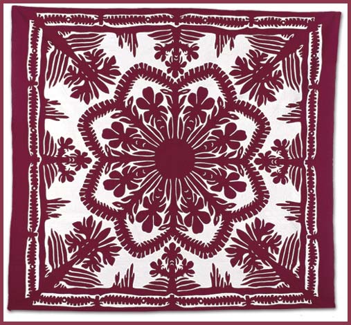Experience the color burst of Torch Ginger in pink, white and red - a trio of very familiar and abundant sights in Hawai’i. This design is one of the many beautiful floral designs used in quilting. Orchids are added to accent the quilt and the result is a stunning quilt design. This quilt is well centered and the elegant design flows nicely around the borders. This beautiful bedspread truly "brings the tropics in". An exquisite piece with MUCH ALOHA...
