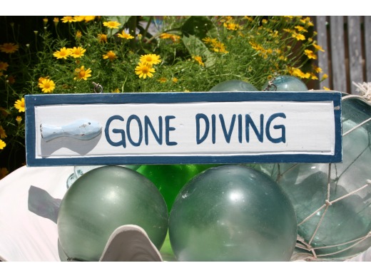 Here is very cute "Gone Diving" wooden sign in blue / red / yellow coastal colors!