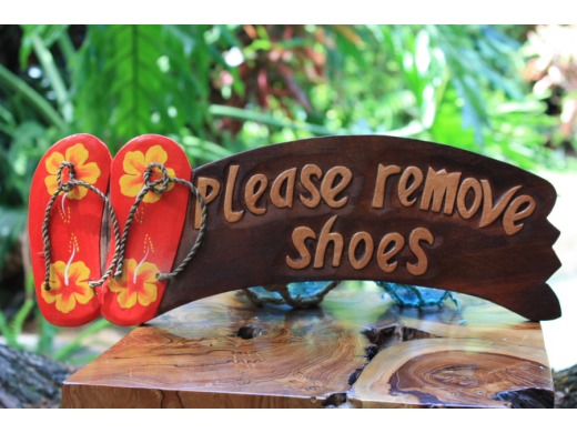 This is a hand made, retro Hawaiian style "PLEASE REMOVE YOUR SHOES" tiki hut sign featuring carved slippers (slippahs) on the side. The wood has been hand painted for durability which adds it's own artistic touch and rustic feel. The sign measures: 7.5" high x 16" wide. It comes ready to hang.