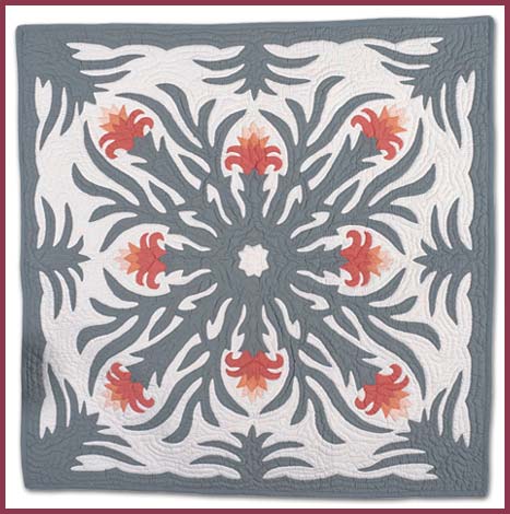 Each wall hanging is hand quilted by Master Quilters taught in the traditional Hawaiian style of quilting. Each Quilt has over 250,000 stitches and average 6-8 stitches per inch. We appliqué the design using the hidden or "blind" stitch onto the background material. It is then quilted with a ripple or echo pattern. Every piece is hand made with great care to insure your total satisfaction. Please contact us for availability and special orders (at NO EXTRA COST!).