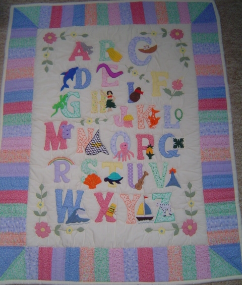 Our keikis are our treasures in Hawaii... They are given the utmost care and attention in the true aloha spirit. This ABC baby quilt was hand stitched and appliqued and features extraordinary traditional Hawaiian quilting flower patterns between the lettering.