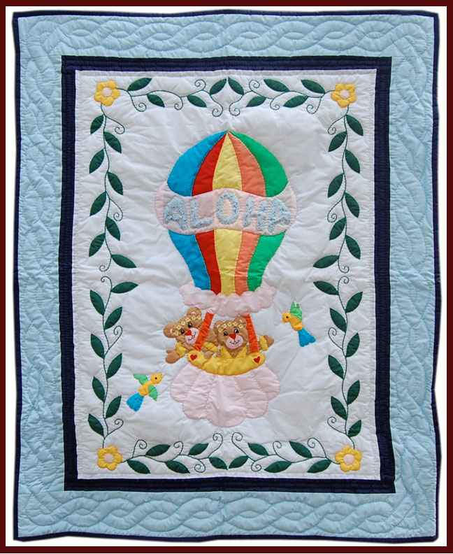 Hawaiian keikis(children) are special and a very important part of our culture in Hawaii. They are given the utmost care and attention in the true aloha spirit. This "ALOHA BALLOON" baby quilt was hand stitched and appliqued and features traditional Hawaiian themes.