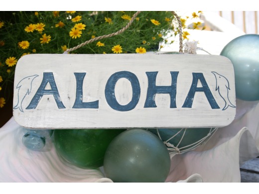 Here is a Hawaiian beach/cottage style "ALOHA" welcome sign in rustic white & blue coastal colors.