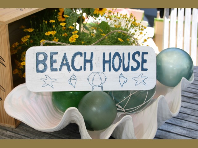 Here is a Hawaiian beach/cottage style "BEACH HOUSE" welcome sign in rustic white & blue coastal colors.
