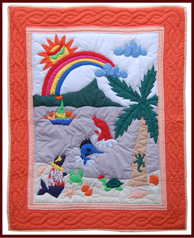 Hawaiian keikis(children) are special and a very important part of our culture in Hawaii. They are given the utmost care and attention in the true aloha spirit. This "COOL SUN" baby quilt was hand stitched and appliqued and features extraordinary traditional Hawaiian themes.