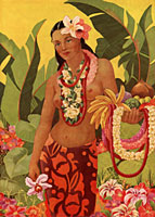 This vintage menu cover(Ca.1948), portrays a graceful bare breasted island girl holding flower leis and exotic fruits. The tropical foliage in the background adds to the island flair of this print.